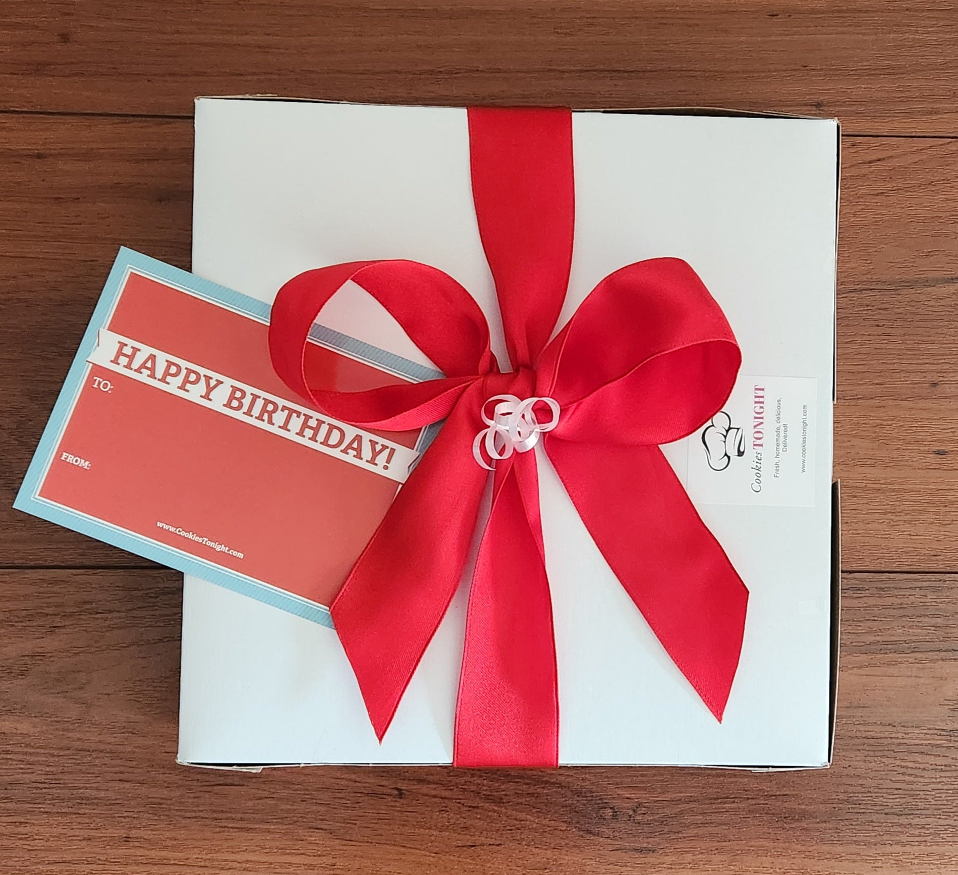 Beautiful box with red ribbon and message card.